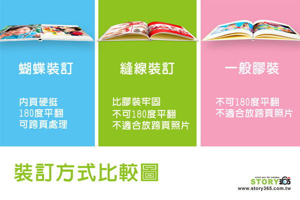 STORY365提供你多種尺寸、不同裝訂、多種主題,在STORY365你可擁有最適合的相片書!